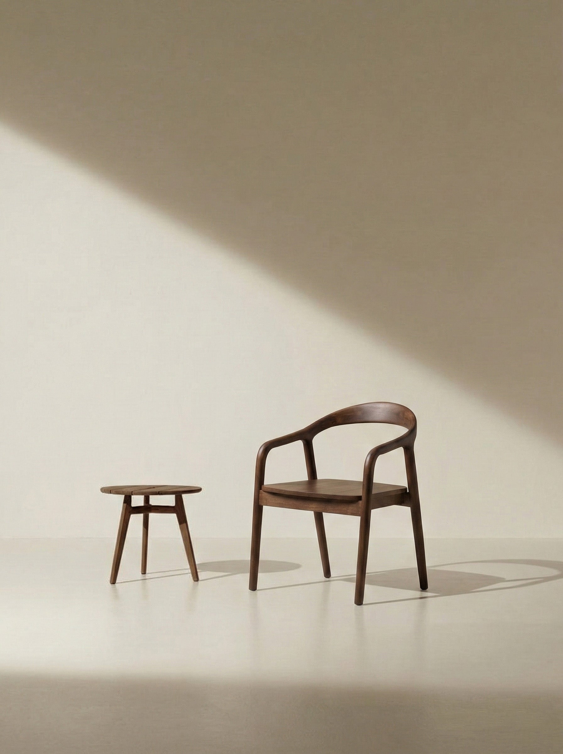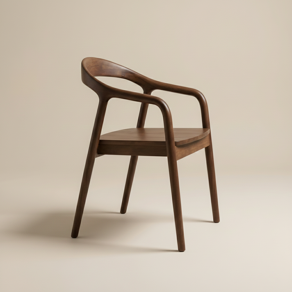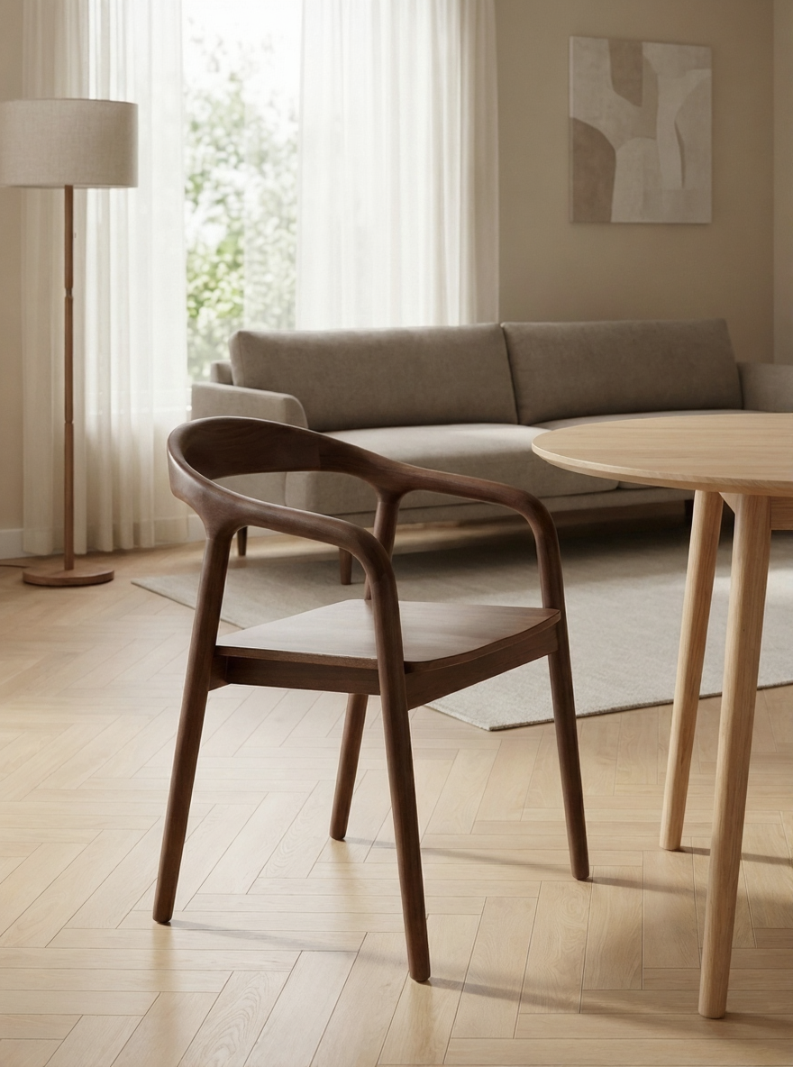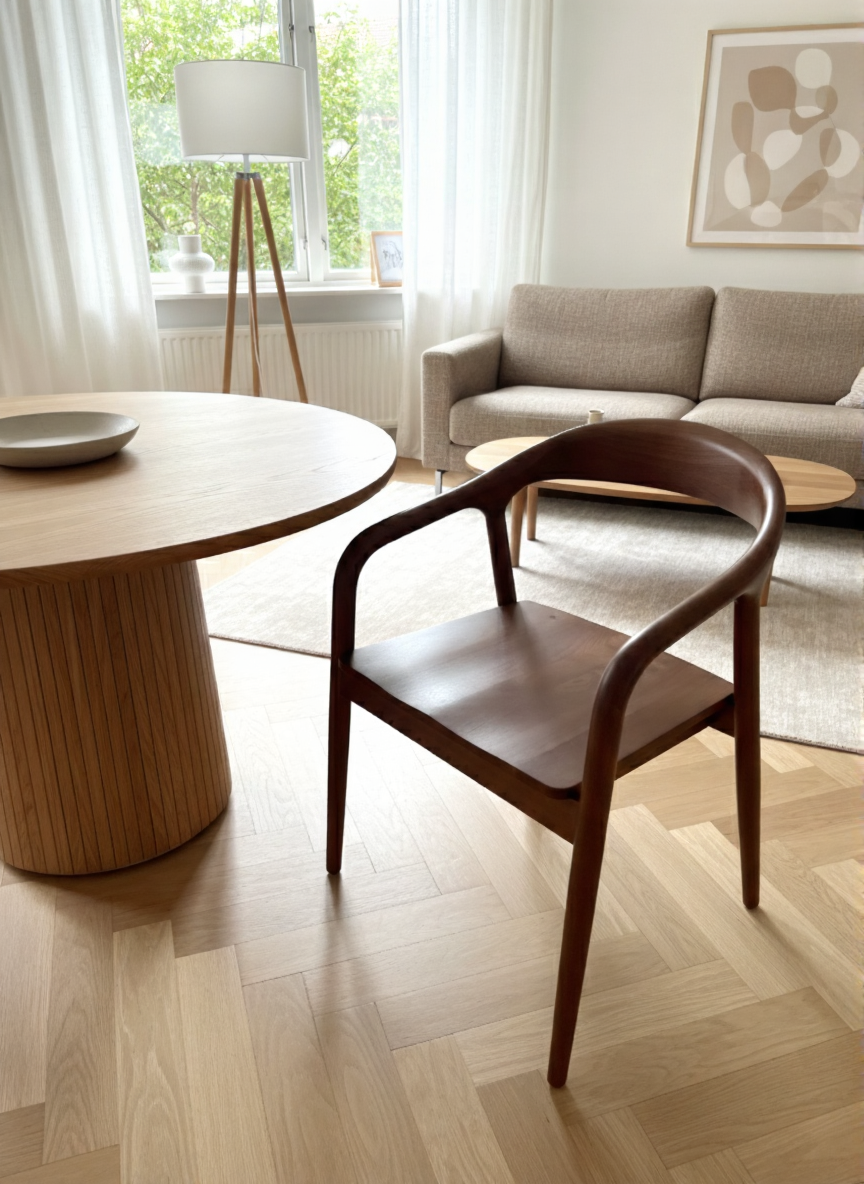 Kontrast pomiędzy ciepłem litego drewna a tapicerowanym siedziskiem nadaje krzesłu wizualnej lekkości i nowoczesnego charakteru. Całość sprawia wrażenie formy ukształtowanej z jednego elementu – harmonijnej, wyważonej i ponadczasowej.
