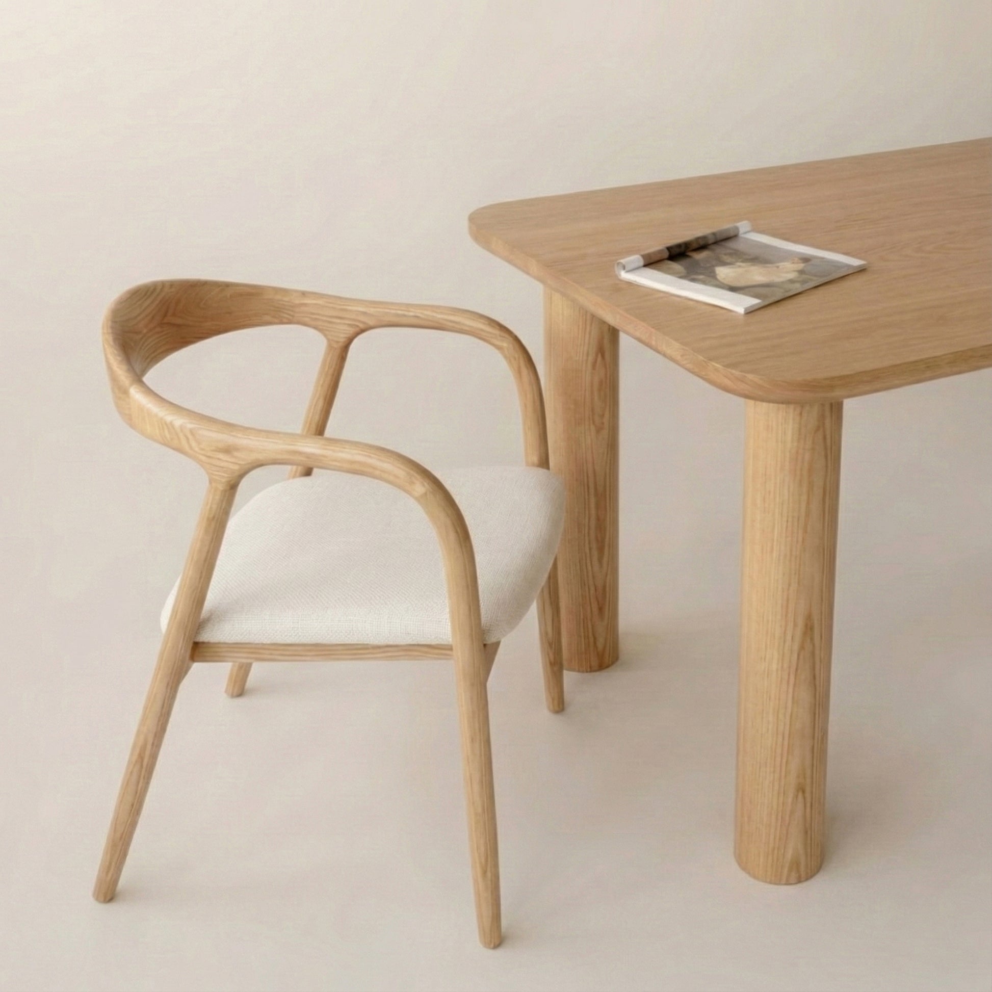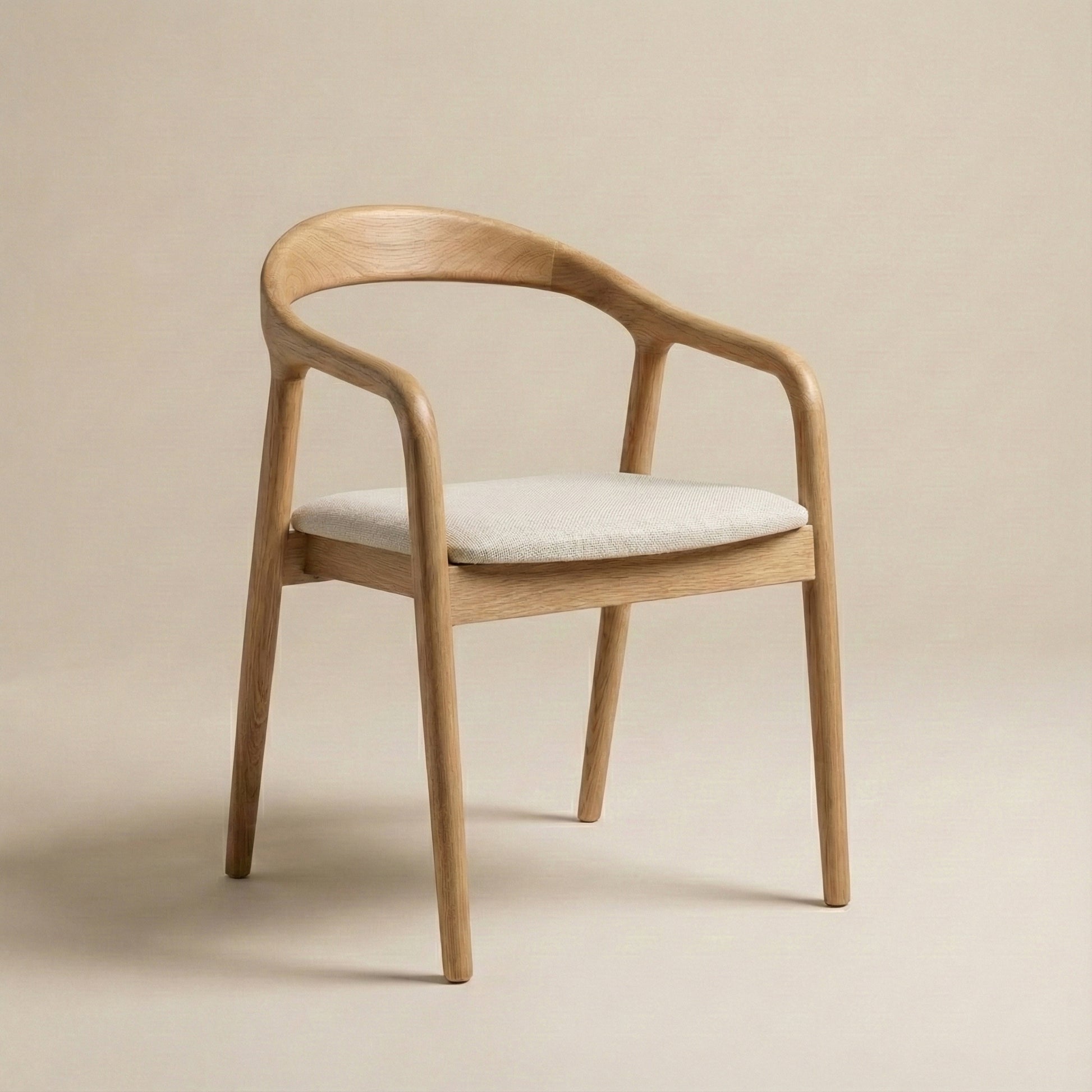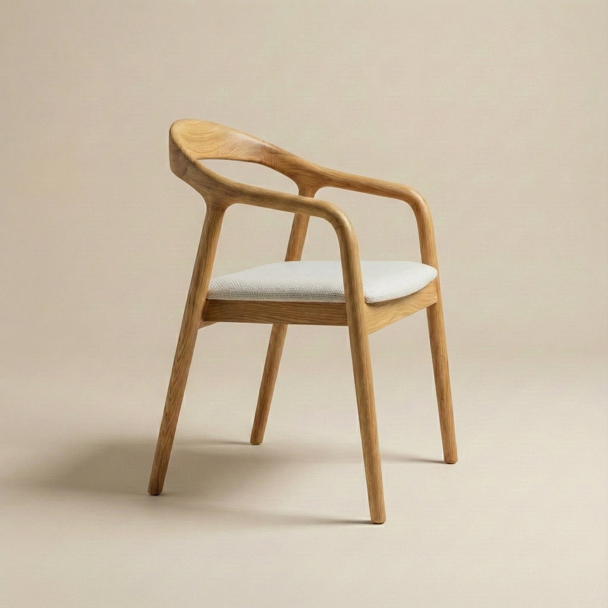 Kontrast pomiędzy ciepłem litego drewna a tapicerowanym siedziskiem nadaje krzesłu wizualnej lekkości i nowoczesnego charakteru. Całość sprawia wrażenie formy ukształtowanej z jednego elementu – harmonijnej, wyważonej i ponadczasowej.