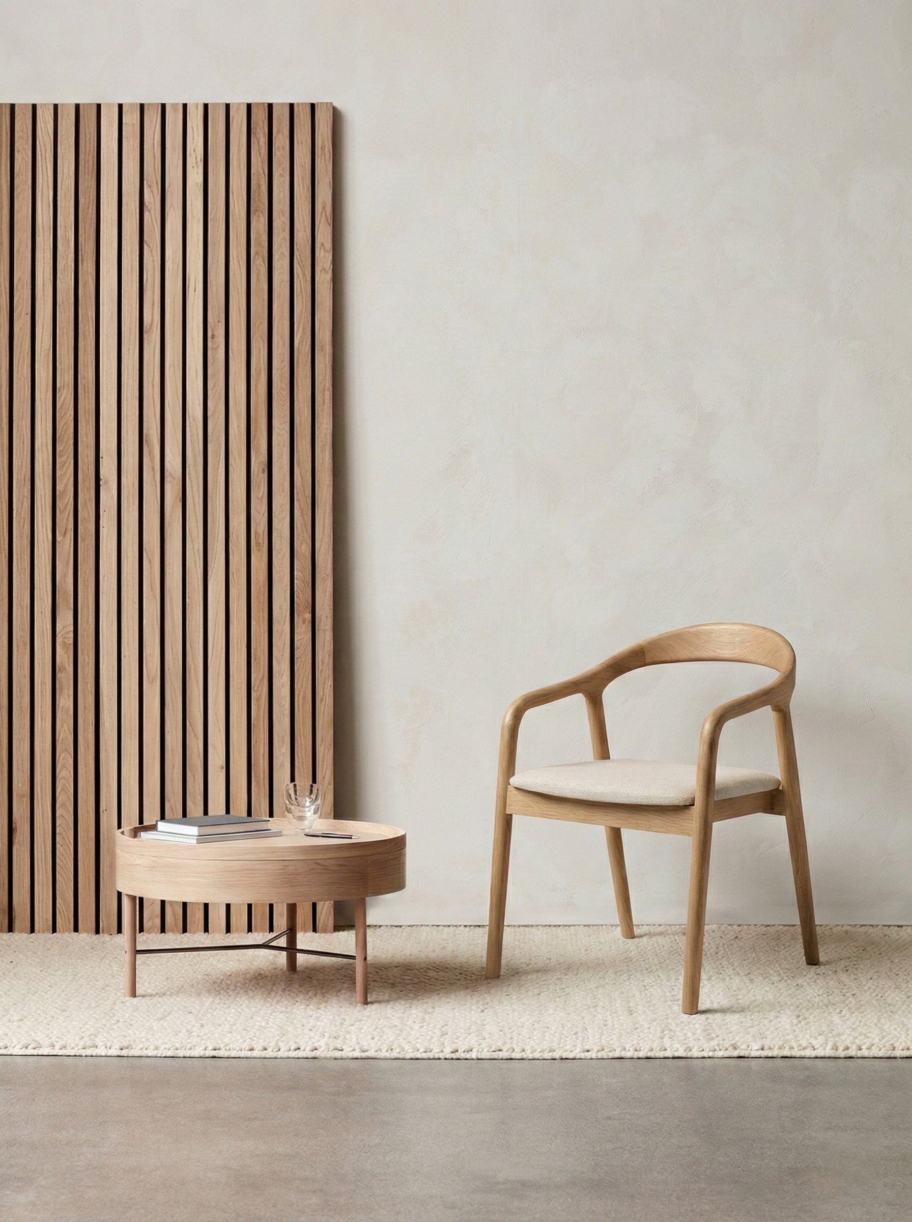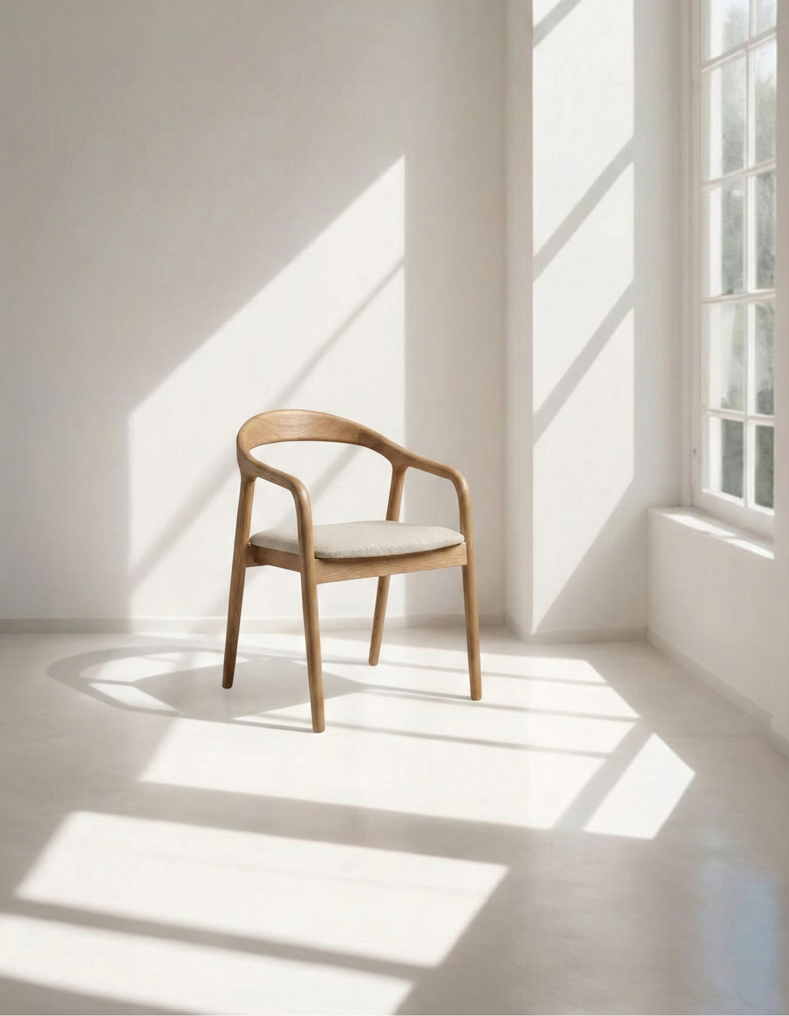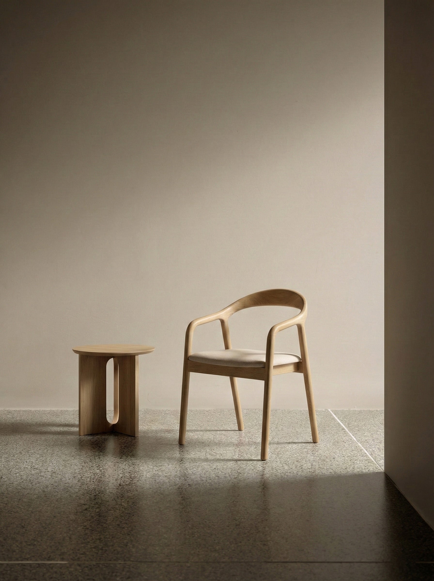 Kontrast pomiędzy ciepłem litego drewna a tapicerowanym siedziskiem nadaje krzesłu wizualnej lekkości i nowoczesnego charakteru. Całość sprawia wrażenie formy ukształtowanej z jednego elementu – harmonijnej, wyważonej i ponadczasowej.